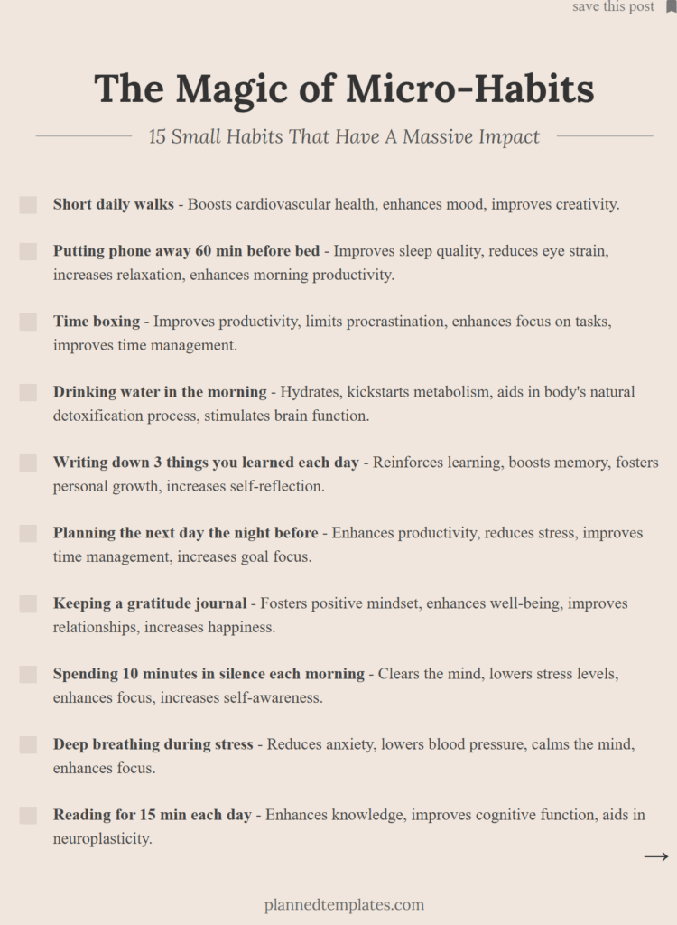 The “magic” of these habits lies in their size. Because they are small, they are difficult to say “no” to. You might not have the energy for a one-hour gym session, but you have the energy for a 10-minute walk.